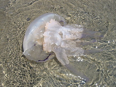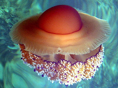 Es sieht so aus als würden die Quallen im Wasser schweben. Sie schwimmen aber nur auf und ab. Innen sind sie voller Gelee, das kann man aber nicht essen. Die Tentakel der Quallen sind gefährlich, der Körper aber nicht. Quallen leben im Meer.