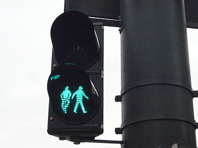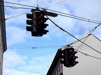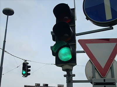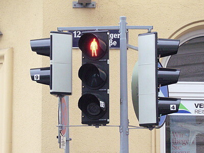 Die Ampel leuchtet rot, grün und gelb. Die Autos müssen stehenbleiben, wenn sie rot zeigt. Die Autos dürfen fahren, wenn sie grün zeigt.